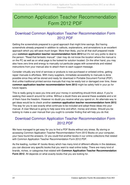 Read Online COMMON APPLICATION TEACHER RECOMMENDATION FORM 2012 Ebook Reader By Click Button. COMMON APPLICATION TEACHER RECOMMENDATION FORM 2012 Ebook it’s easy to recommend a new book category such as Novel, journal, comic, magazin, ect. You see it and you just know that the designer is also an author and understands the challenges involved with having a good book. You can easy klick for detailing book and you can read it online, even you can download it